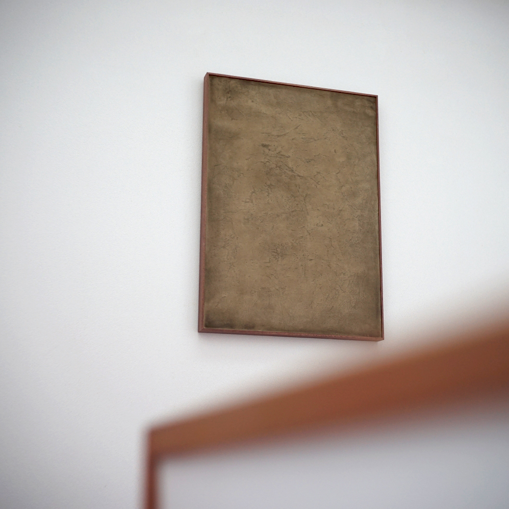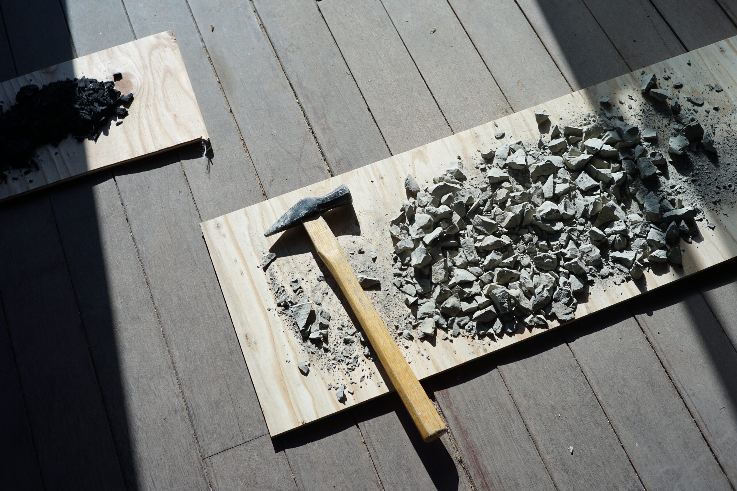 建物が建つ千葉県いすみ市で採集/回収した天然素材や廃材から、海岸の砂、砂層の土、竹害対策の竹炭などを選び、アートワーク、スピーカー、コーヒーテーブルそれぞれを、現地で塗装。